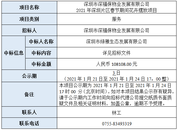 深圳市必一运动物业发展有限公司2021年深圳片区春节期间花卉摆放项目已完成评审,现将本项目评审的相关情况及结果进行公示,具体内容如下: