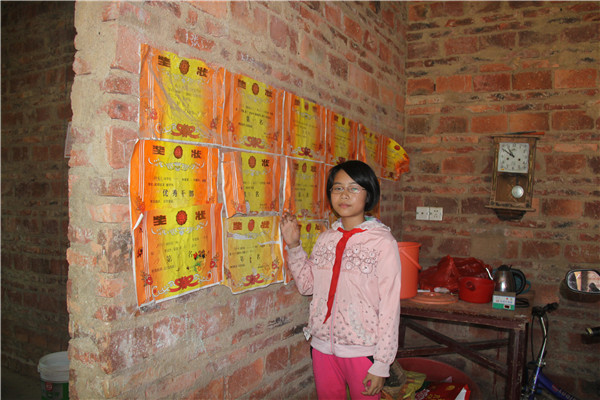 其实这都不是个案,在长期的跟踪管理及家访中,必一运动发现助学孩子中90%都是留守儿童,50%为单亲家庭,今年孤儿已增至4人,他们兄弟姐妹大都4、5个,老人年迈,部分父母或身有残疾,或患精神病,或丧失劳动力,许多靠种农田或打打小工勉强维持生计。困难虽如此,但助学的孩子们却依然坚强而努力,面对墙上贴满的一张张奖状,必一运动又怎么能不为他们自豪呢?